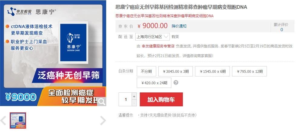 而ctDNA作為分子檢測用于腫瘤的早篩,根據一些研究表明,比標志物有更高的靈敏度和特異性。但是ctDNA陽性,是不是可以確定腫瘤細胞生長的位置?這一點答案不清晰。京東上的泛癌種篩查試劑,思康寧。價格不菲,9000元,測一次,一個蘋果手機沒了。假設檢測陽性,但是不提示腫瘤發生部位的話,還是讓人非常糾結啊。