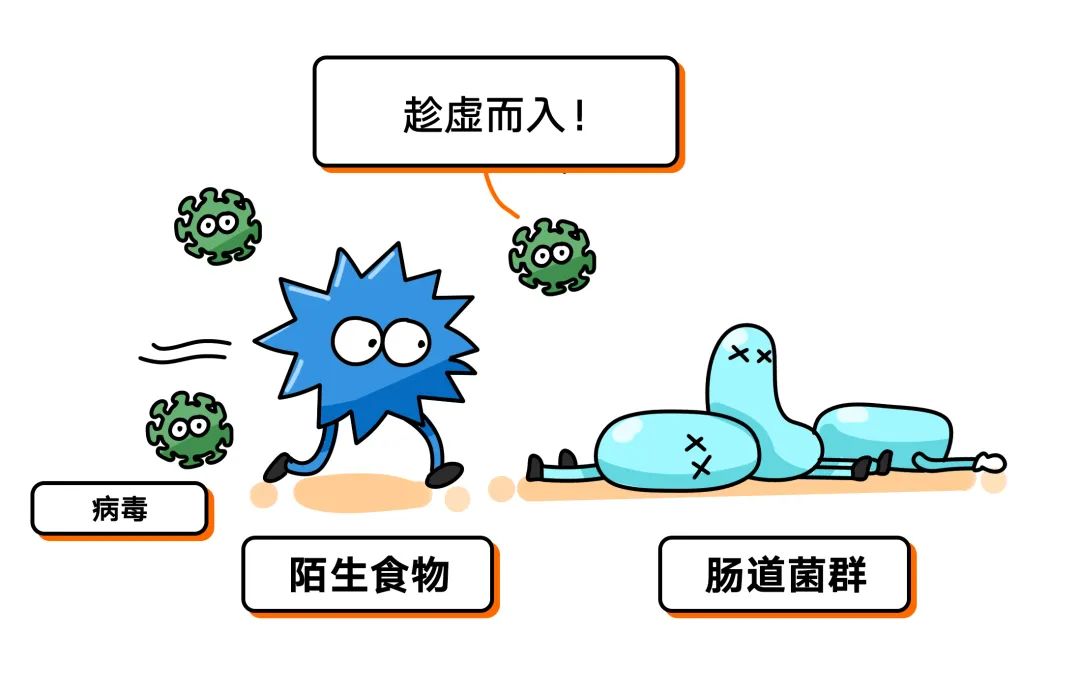 食譜突然改變,腸道菌群倒下一片,腸道黏膜通透性增加,一些毒素趁亂入侵,于是造成腹瀉、發燒等水土不服的癥狀。