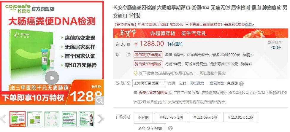 但是在特殊的場景下,如康利明公司的長安心 人類SDC2基因甲基化檢測試劑盒,通過檢測糞便實現腸癌的早期篩查,靈敏度84.2%,特異性93.6%。京東售價1288元。感覺還過得去。